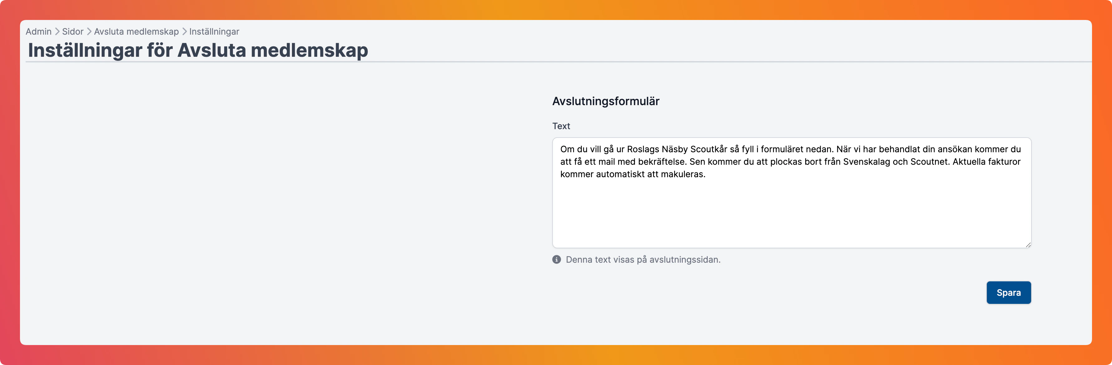Under Admin > Sidor > Avsluta medlemskap > Inställningar kan ni även anpassa texten som visas på det publika utträdesformuläret.