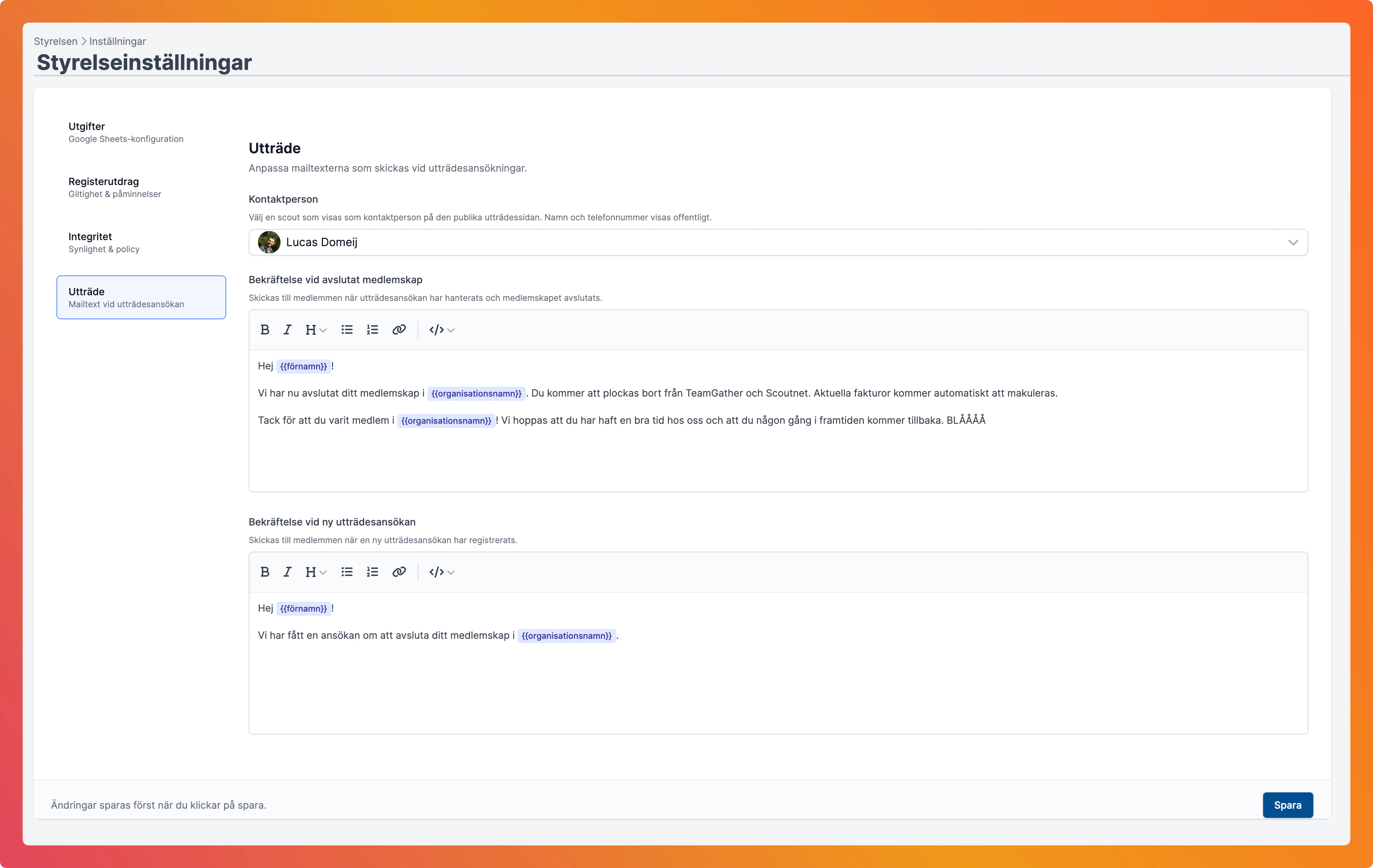 Innan ni börjar använda utträdesfunktionen kan ni anpassa den under Styrelsen > Inställningar > Utträde.