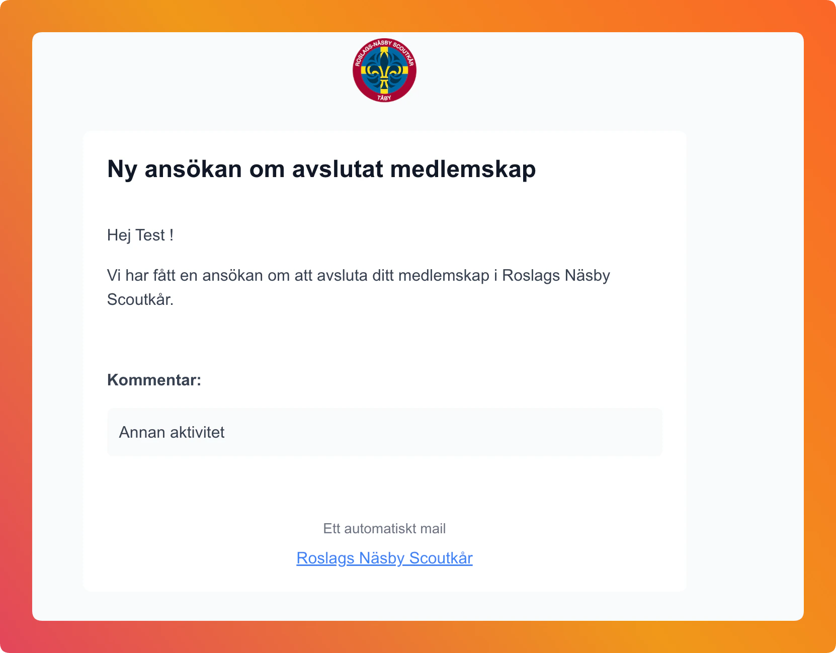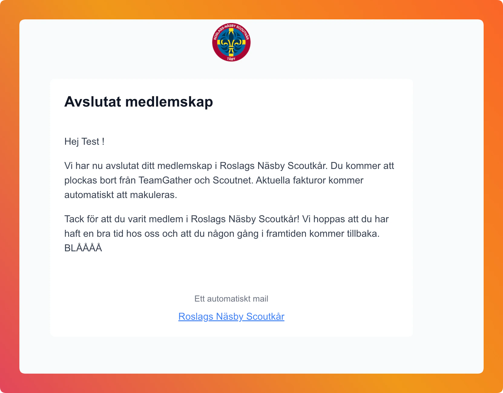 - Bekräftelse vid avslutat medlemskap – Skickas till medlemmen när ni markerat ansökan som hanterad.
